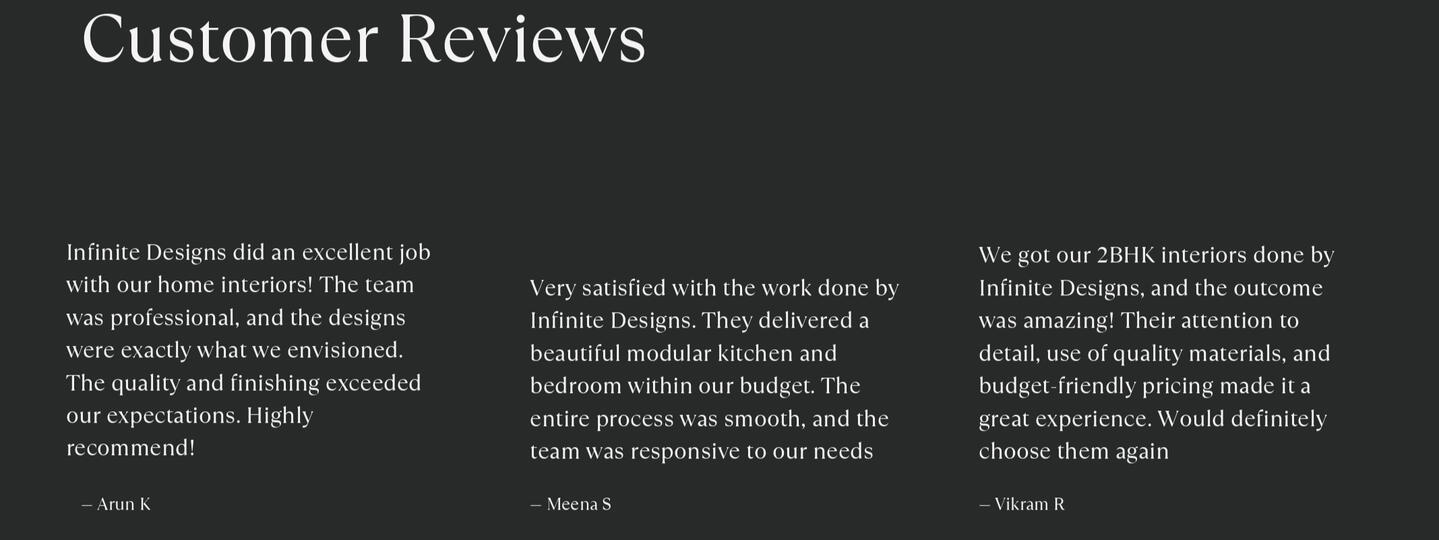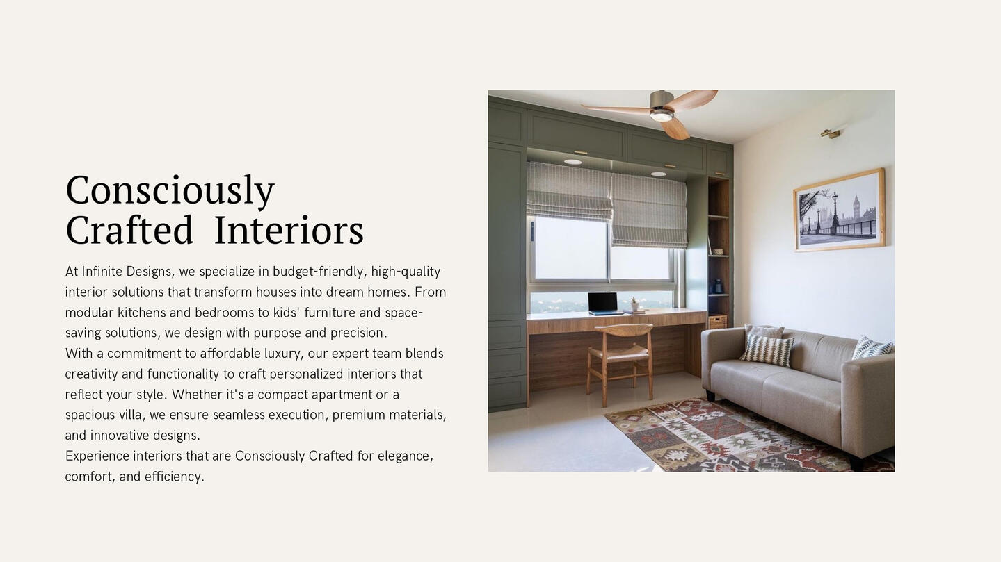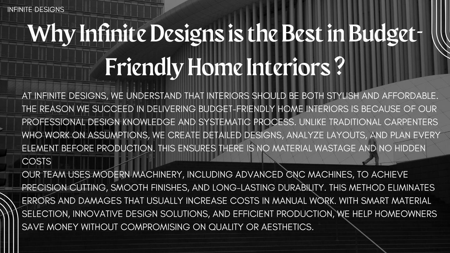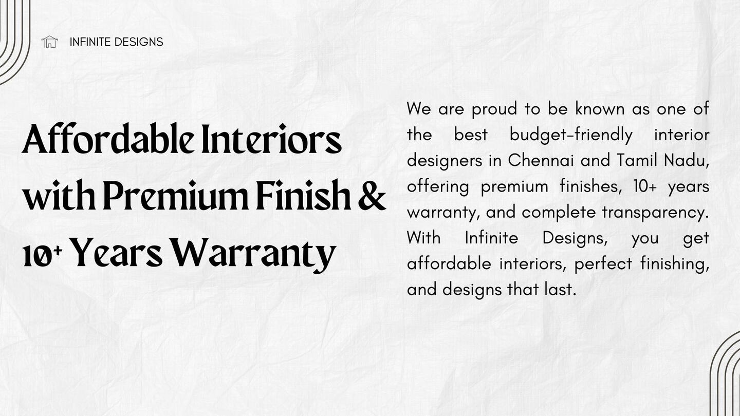 Looking for budget-friendly home interiors in Chennai? At Infinite Designs, we specialize in creating stylish, functional, and affordable interiors that perfectly suit your lifestyle. Our expert team designs modular kitchens, wardrobes, TV units, bedrooms, and complete home interiors with high-quality finishes—at prices that fit your budget.We believe a dream home should be beautiful, practical, and cost-effective. That’s why we use smart space planning, durable materials, and modern designs to deliver premium-looking interiors at budget-friendly prices. Whether you own a 1BHK, 2BHK, or 3BHK apartment or villa in Chennai or Tamil Nadu, our customized interior packages ensure the best value for your investment.From design consultation to execution, we provide transparent pricing, affordable packages, and end-to-end service so you can enjoy a stress-free experience. With us, you don’t just get interiors—you get a home that reflects your personality.Choose Infinite Designs for budget interiors in Chennai and Tamil Nadu—where style meets affordability without compromise.Contact us today for a free consultation!